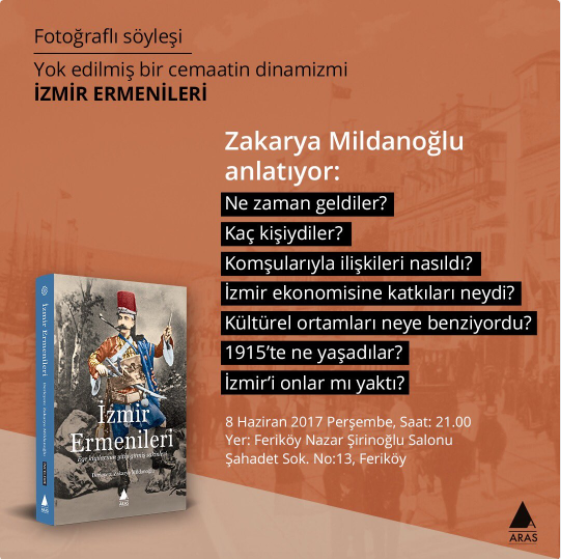 Zakarya Mildanoğlu'nun 'kısa bir süre önce Aras Yayıncılık tarafından yayımlanan İzmir Ermenileri' söyleşisi bu akşam Nazar Şirinoğlu Salonu’nda konuşulacak.