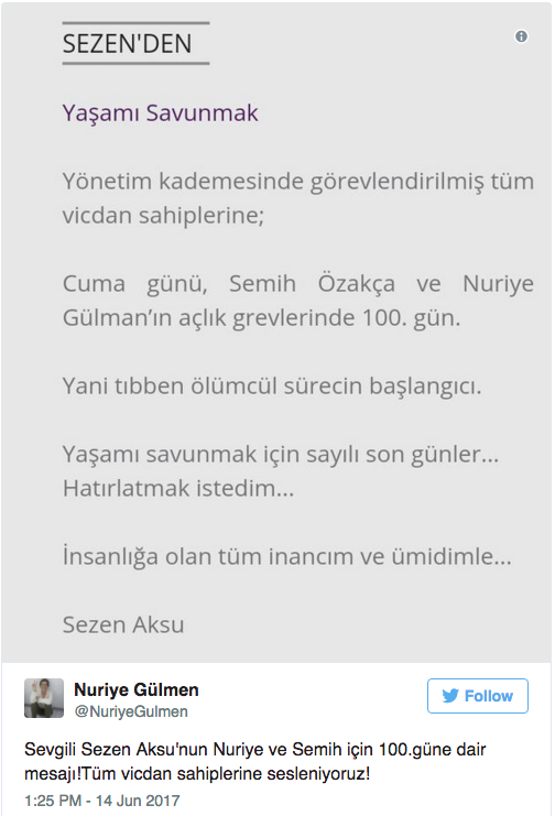 23 Mayıs’tan beri tutuklu olan Nuriye Gülmen ve Semih Özakça’nın, OHAL KHK’sıyla atıldıkları işlerine iade edilme talebiyle başlattıkları açlık grevi bu Cuma 100. gününe giriyor. Sezen Aksu, Gülen ve Özakça için 'yaşamı savunak için son günler' diyen bir çağrı yayımladı.