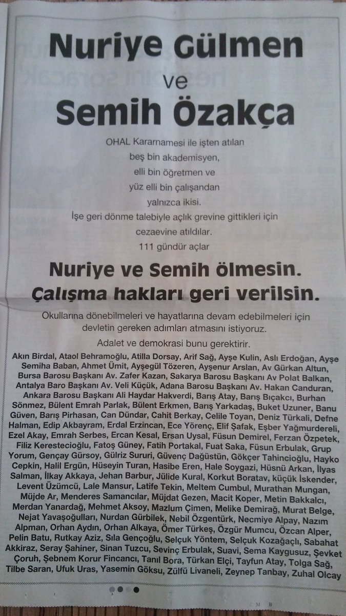 111 sanatçı ve aydın, açlık grevlerinin 111. gününde olan ve tutuklu bulunan akademisyen Nuriye Gülmen ve öğretmen Semih Özakça için gazetelere ilan verdi.