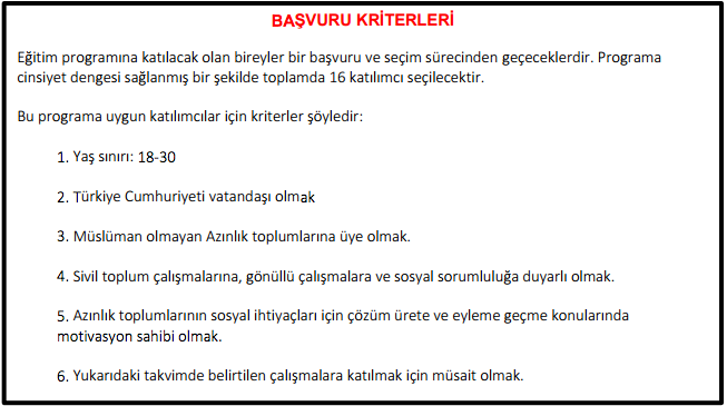 13 Temmuz’da kadar buildingtogether@rumvader.org adresine gönderilecek başvurularda CV’nin yanı sıra gençlerin hangi Azınlık toplumuna mensup olduğunun ve daha önce sivil toplum çalışmalarında bulunup bulunmadığının da belirtmesi talep ediliyor.