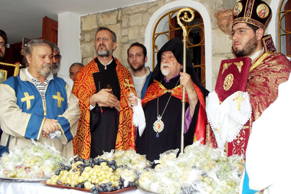 Meryem Ana Yortusu için Vakıflı Köyü Kilisesi’nin taş avlusunda bir araya gelenler önce dua etti, ardından da kutsanan üzümlerden ve yedi kazanda kaynayan harisa’dan yedi.