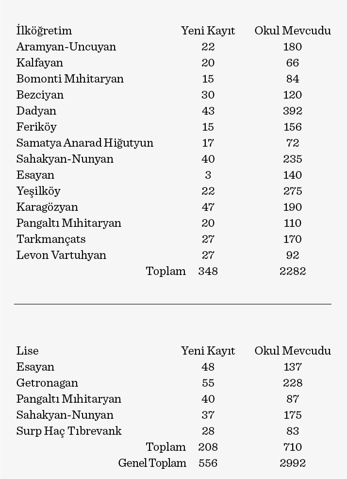 13 Eylül itibariyle Ermeni okullarındaki öğrenci mevcutları şöyle: