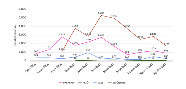 *“Terör örgütleriyle irtibatı olduğu değerlendirilen” 50 bin 587 kişi hakkında gözaltı işlemi uygulandı. Gözaltına alınanların yüzde 57’si (28 bin 803 kişi) “FETÖ/PDY”, yüzde 40’ı (17 bin 196 kişi) “PKK/PYD” ve yüzde 7,9’u (4 bin16 kişi) “DAEŞ” ve yüzde 1,1’i (572 kişi) “sol örgütler” ile ilişkili olarak nitelendirildi.