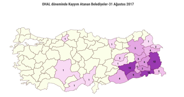 *İHOP’un raporunda kayyum atanana belediyeler de yer aldı. Buna göre, 1’i MHP ve 4’ü AKP olmak üzere 94 belediyeye kayyum atandı. Atanan belediyelerin geri kalanı DBP’ye aitti.