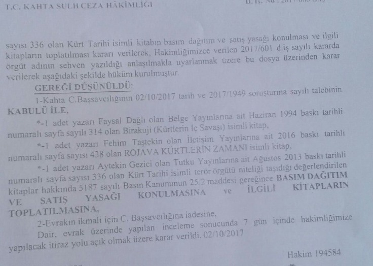 Kahta Sulh Ceza Hakimliği, Taştekin’in kitabının yanı sıra Faysal Dağlı’nın Belge Yayınları’ndan 1994’te çıkan Birakuji (Kürtlerin İç Savaşı) ve Aytekin Gezici’nin Tutku Yayınları’ndan 2013’te çıkan Kürt Tarih kitaplarını da yasakladı.