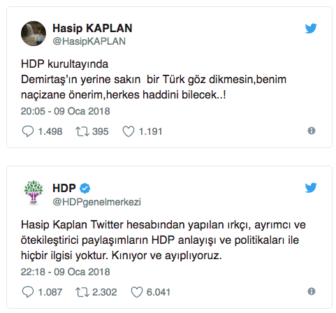 Hasip Kaplan'ın Twitter hesabı aracılığıyla yaptığı paylaşımlar üzerine HDP'nin kurumsal hesabından "Hasip Kaplan Twitter hesabından yapılan ırkçı, ayrımcı ve ötekileştirici paylaşımların HDP anlayışı ve politikaları ile hiçbir ilgisi yoktur. Kınıyor ve ayıplıyoruz" mesajı yayımlandı.