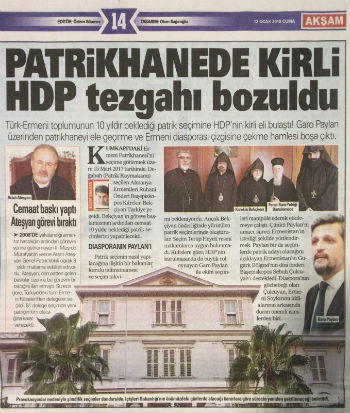 Akşam gazetesi, 12 Ocak 20181’de ‘Patrikhanede kirli HDP tezgahı bozuldu’ başlıklı bir haberde, HDP İstanbul Milletvekili Garo Paylan’ın patriklik seçimini manipüle etmeye çalıştığı iddia edildi. Paylan, Akşam gazetesinin haberine tepki gösterdi.