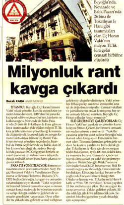 Çekem’e göre Vakıf emin ellerde ve gayet iyi yönetiliyor. O zaman biz de bıkmadan usanmadan bir kez daha soralım; Madem öyle, gelir kaynakları en güçlü Ermeni Vakfı olan Üç Horan, 2011’de neden 118 bin TL zarar açıkladı? Aralarında Tokatlıyan Han’ın da bulunduğu pek çok gayrimenkulün sahibi olan bir Vakıf, önceki yıllarda sürekli kâr açıklarken, 2011’de ne oldu da 118 bin TL zarar etti?