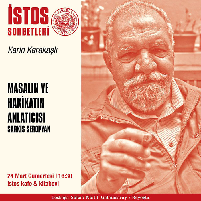 ‘istos kafe&kitabevi’nde her hafta yapılan ‘istos sohbetleri’nde bu hafta Agos Gazetesi Ermenice sayfalarının eski editörü Sarkis Seropyan anılacak. 24 Mart’taki Karin Karakaşlı ile “Masalın ve Hakikatın anlatıcısı: Sarkis Seropyan’ başlıklı sohbette, Seropyan’ın kurucularından olduğu Agos gazetesiyle serüveni üzerine konuşulacak.