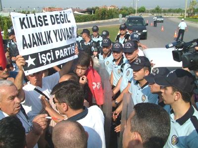 Denizli'de Yenişehir Mahallesi Esnaf Sitesi'nde açılan kilisenin, MHP’li üyeler tarafından kapatılması isteğiyle Belediye Meclisi gündemine taşınmasının ardından bu kez İşçi Partililer durumdan vazife çıkardı. İşçi Partili (İP) ve Türkiye Gençlik Birliği (TGB) üyesi bir grubun, kilisenin önünde basın açıklaması yapmasına polis izin vermedi.