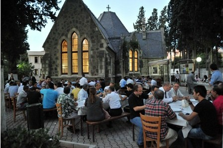 Aynı zamanda tarihi bir hazine niteliğindeki kilisenin bahçesine girer girmez güleryüz ve sıcacık bir “Merhaba”yla karşılanıyoruz. Protestan Baptist Kiliseleri Derneği Yönetim Kurulu Başkanı Ertan Çevik, tüm konuklarıyla tek tek ilgileniyor. Gecenin anlamına uygun biçimde herkes, dilediği yere karışık oturuyor. Bizim oturduğumuz masada Işık Kilisesi ve Alsancak St. John Kilisesi’nin rahipleri var. Ülkemizi, insanlarını ne kadar sevdiklerini anlatıyorlar. Uzun yıllardır İzmir’de yaşıyorlar. Öğreniyoruz ki yemekleri, Buca Belediyesi’nin iftar çadırından katkı teklifi olmasına rağmen cemaat kendi imkanlarıyla hazırlamış. Masalara servisi yine kendi elleriyle yapıyorlar. Kilisenin bahçesi dolu. Yaklaşık 100 kişi var. Bunlar arasında her görüş ve dinden temsilciler bulunuyor. AK Parti İzmir Milletvekili Rıfat Sait, eşi Sevilay Sait’le katılmış. CHP’li Buca Belediye Başkanı Ercan Tatı, İzmir Kültürler Arası Diyalog Merkezi (İZDİM) Başkanı Şemsettin Ayyıldız, Buca Müftüsü Adem Gülmek, CHP İlçe Başkanı Bektaş Gül, AK Parti İlçe Başkanı Mustafa Solmaz, AK Parti Gaziemir İlçe Başkanı Sabır Telingün, Buca Belediyesi meclis üyeleri, sivil toplum temsilcileri ve her cemaatten vatandaşlar bu hoşgörü sofrasının etrafındakiler...