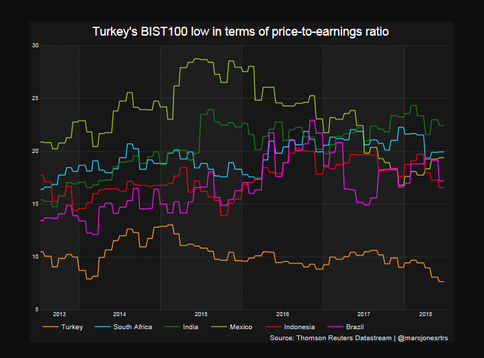 Finansal analistlerin hisse senetlerinin değerini ölçmede başvurdukları başlıca yöntemlerden biri fiyat/kar orantısıdır. Burada sayı ne kadar düşükse menkul kıymet o kadar ucuzdur. İstanbul BIST 100 endeksinin sayılarını bu yöntemle incelediğimizde, borsanın genel P/E oranının diğer büyük EM (Gelişen Piyasalar) hisse senedi piyasalarından çok daha düşük olduğunu görüyoruz.