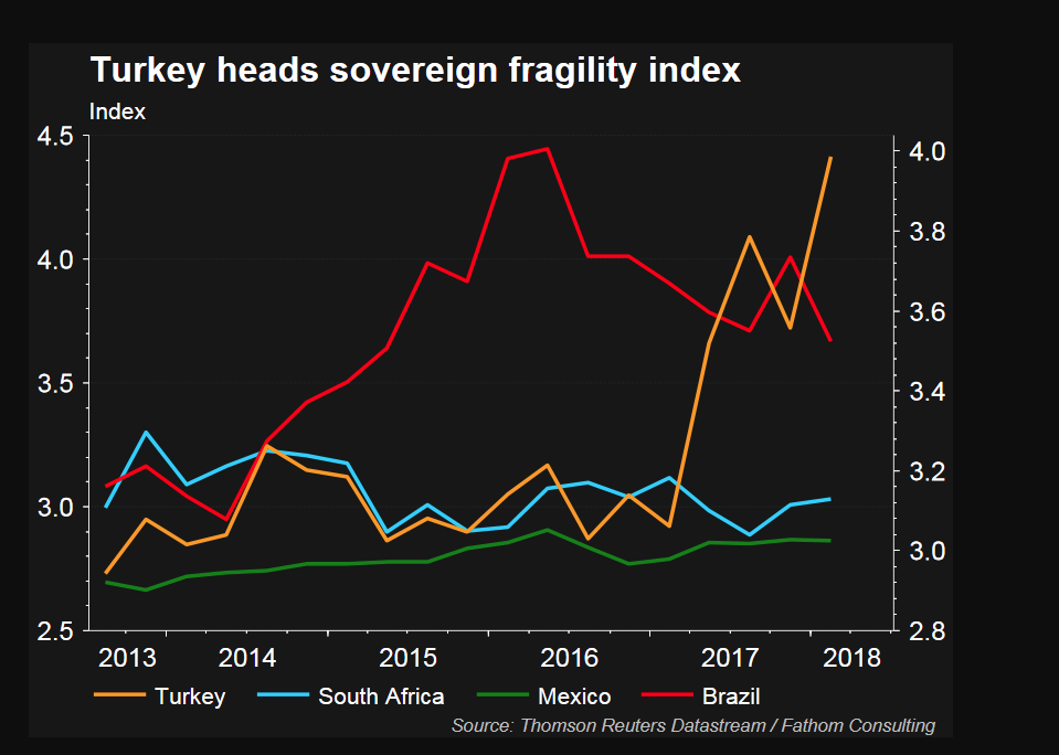 Fathom Consulting'in devlet finansal kırılganlığı kompozit göstergesi durumun Türkiye için ne kadar kötüye gittiğini gösteriyor. Gösterge, her ülkenin temerrüt riski, enflasyon riski ve 10