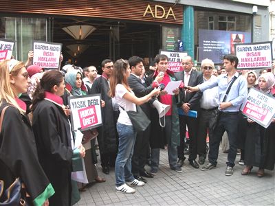 Hukukçular Derneği üyesi yaklaşık 100 avukat, İstanbul Barosunu başörtülü avukatların mesleklerini icra etmek için uyguladığı yasakları protesto etmek için Taksim Meydanı’nda toplandı. ‘Yasak değil hukuk üret’ , ‘Katil avukat olur, başörtülü olamaz’ , Baroya rağmen insan haklarını savunacağız’ , ‘Ey baro söyle, avukat için ne yaptın’ yazılı dövizler taşıyan avukatlar, İstiklal Caddesi üzerinden İstanbul Barosu’na kadar sesiz bir şekilde yürüdü.