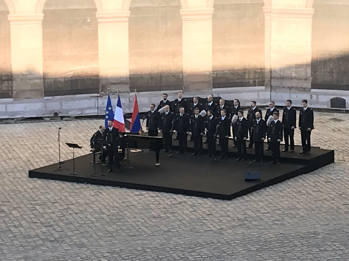 Tören, Fransa'da devlet törenlerinin düzenlendiği Les Invalides Askeri Müzesi'nin avlusunda gerçekleşti.. Aznavour'un Fransız bayrağına sarılı naaşı avluya askerler eşliğinde getirilirken, önce Ermenistan'ın, ardından da Fransa'nın milli marşları çalındı. Cenaze töreninin ev sahipliğini, Fransa Cumhurbaşkanı Emmanuel Macron yaptı.