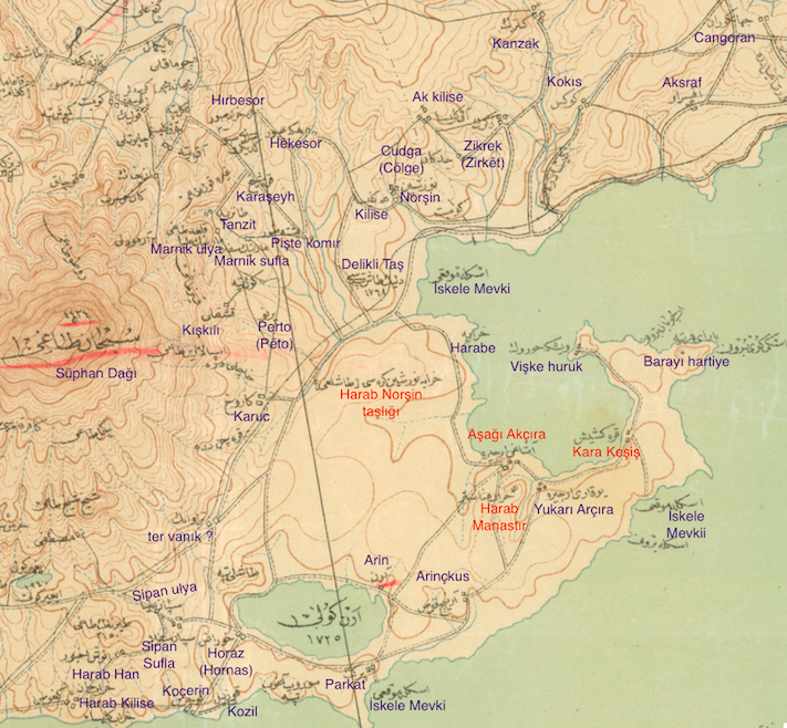Adilcevaz’a bağlı Vêçkashor (Vêçgazoruk) (Günümüzde böyle bir köy yok) , Guzel (günümüzde böyle bir köy yok ) Kara Keşiş (Qere Keşîş -Yarım ada ), Verin Arçira (Axçira -Akçıra), Nerkin Arçira (Terxanî), Arîncgos (Ar (inç)kûs- Kavuştuk ), Arin (Arûn-Göldüzü), Pargad (Pargat-Esenkıyı), Khorants (Xornas-Karşıyaka), Murxus, (mirxûs-İpekçayır), Norşen (Norşîn-Heybeli), Eketsor (Hêkesor-Gümüşdöven), Bêşnakomer (Pêşnekomir-Kömürlü), Goçer (Koçeri- Erikbağı), Kozox(h) ( Kanzoxa-Aydınlar), Verin Sipan (Sîpanê Jorê -Yukarı Süphan), Nerkin Sipan (Sîpanê Jêrê-Aşağı Süphan), Koğos (Koz), Norşang (Norşînciq-Harmantepe), Manik (marnûk), Kherbesor (Xirbesor-Örentaş ), Perto (Pêto), Qişqilî, Khereşekh (Qereşêx), Zirket (Zirkêt-Akyazı), Taşuga (Taşquna-Taşkın) ;