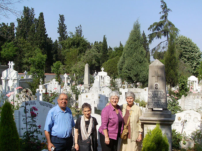 Tarihçi Anahide Ter Minassian, ninesi Gülizar, dedesi Muş mebusu Keğam Der Garabedyan’ın Şişli Ermeni Mezarlığı’ndaki mezarının başında. Agos gazetesinden Sarkis Seropyan, Fransa’daki yayıncısı Editions Paratheses’den Houry Varjabedian ve Aras Yayıncılıktan Paylin Tomasyan. Mayıs/2008