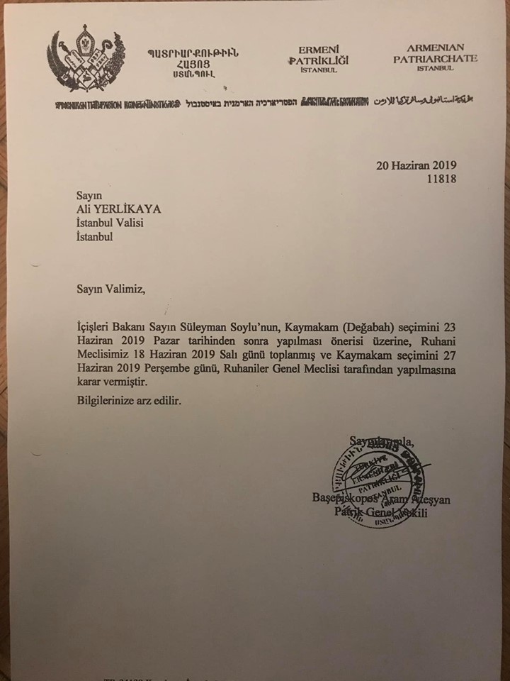 Patrik Mutafyan'ın hayatını kaybetmesinden sonra Ermeni toplumu yeni bir Patrik seçimi sürecine girmişti. Bu çerçevede Patrik seçilene kadar seçim sürecini yürütecek ve Patrikhane'yi yönetecek Patriklik Kaymakamı (Değabah) seçilmesi için hazırlıklara başlanmıştı. Ruhani Kurul geçtiğimiz hafta bir toplantı yaparak 27 Haziran'da Ruhaniler Genel Meclisi'nin katılımıyla Patriklik Kaymakamı seçileceğini açıkladı. Ancak seçimden bir gün önce Patrikhane'ye gelen bir Valilik yazısıyla seçimin 4 Temmuz'da yapılabileceği belirtildi. Yazıda herhangi bir gerekçe bulunmadığı öğrenildi. Gelişmeye dair hem Başepiskopos Ateşyan hem de Ruhani Kurul Başkanı Episkopos Maşalyan feacebook sayfalarından birer açıklama yayınladılar. Maşalyan 27 Haziran'da yapılacak seçime dair Ateşyan eliyle Valiliğe gönderilen mektupta sorun olabileceğini belirtirken Ateşyan ise sabah saatlerinde yaptığı açıklamada "Resmi dairelerle yanlış yazışma olduğu takdirde yazı geri gönderilir ve yenisi istenir, seçim tarihinin değişmesinin bu yazışmalarla ne alakası var?" dedi ve gönderdiği mektubu paylaştı.