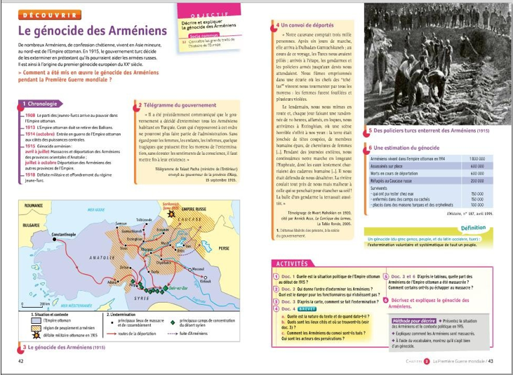 Kitapların Hatier yayınevinden çıkan versiyornunda, iki sayfada yer alan ‘Ermeni Soykırımı’ ünitesi, Kronoloji, Hükümetin telgrafı, Soykırım haritası, Tehcir konvoyu, Foto: Türk polisi ölen Ermenileri gömerken ve Tahmini Sayılarla Soykırım isimli başlıklar altında işleniyor.