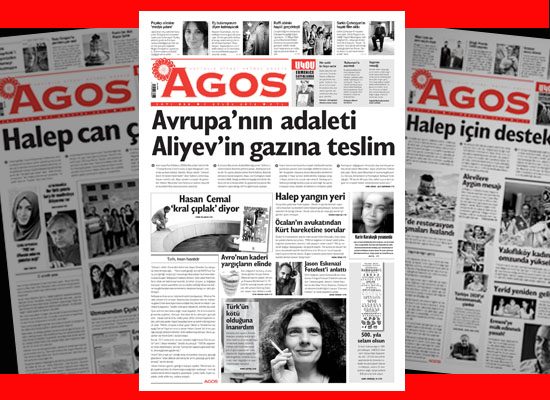 AGOS bu hafta, AB'nin Seferov'un salınmasına göz yummasını manşetine taşıdı: 'Avrupa adaleti Aliyev'in gazına teslim'. Öne çıkan diğer başlıklar; 'Halep yangın yeri', 'Öcalan'ın avukatından Kürt hareketine sorular', 'Hasan Cemal 'kral çıplak diyor'', 'Avro'nun kaderi yargıçların elinde', 'Jason Eskenazi Fotofest'i anlattı', 'Türk'ün kötü olduğuna inanırdım', '500. yıla selam olsun', 'Pıçakçı ailesine medya yalanı' ve daha fazlası.