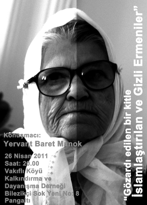 Yervant Baret Manok sunumunun başlığını, ‘Gözardı edilen bir kitle, İslamlaştırılan ve Gizli Ermeniler’ olarak belirlemişti. ‘Bibi’nin fotoğrafının tam da Baret’in anlatacaklarına denk geleceğini düşündüm. ‘Bibi’nin fotoğrafının yarısını kısmen karartarak bir duyuru afişi hazırladık.