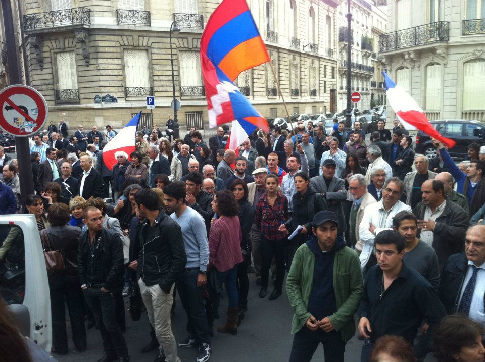 Aynı saatlerde Paris'teki Ermenistan Büyükelçiliği önünde toplanan Türkiyeli ve Azerbaycanlı protestocular, Ermenistan Cumhurbaşkanı Serj Sarkisyan'ı protesto etti.