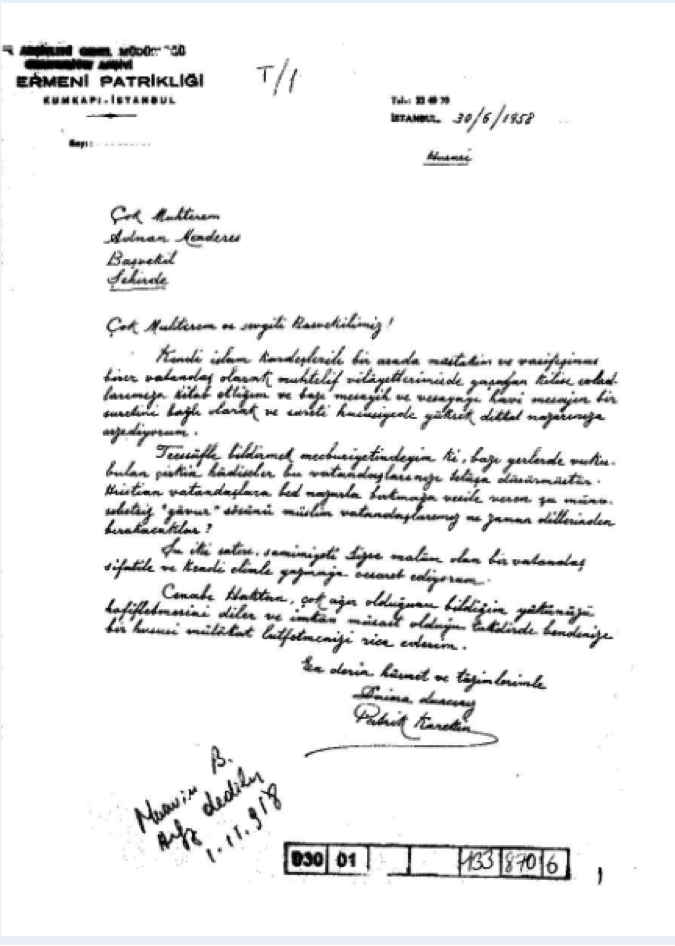 Araştırmacı Mahsuni Gül, devlet arşivlerinden yine ilginç bir belge çıkardı. Türkiye Ermenileri Patriği Karekin Haçaduryan’ın 6-7 Eylül 1955 pogromu sonrasında 1958 yılında Başbakan Adnan Menderes’e yazdığı mektup, gayrimüslimlere yönelik baskı ortamının sürdüğünü gösteriyor.