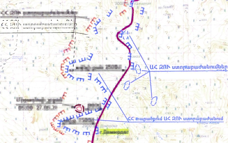 Ermenistan Savunma Bakanlığı Azerbaycan'ın açıklamalarına yanıt olarak olayın geçtiği yeri gösteren bir harita (saat ve tarih yazılı olan bölge) yayınladı: