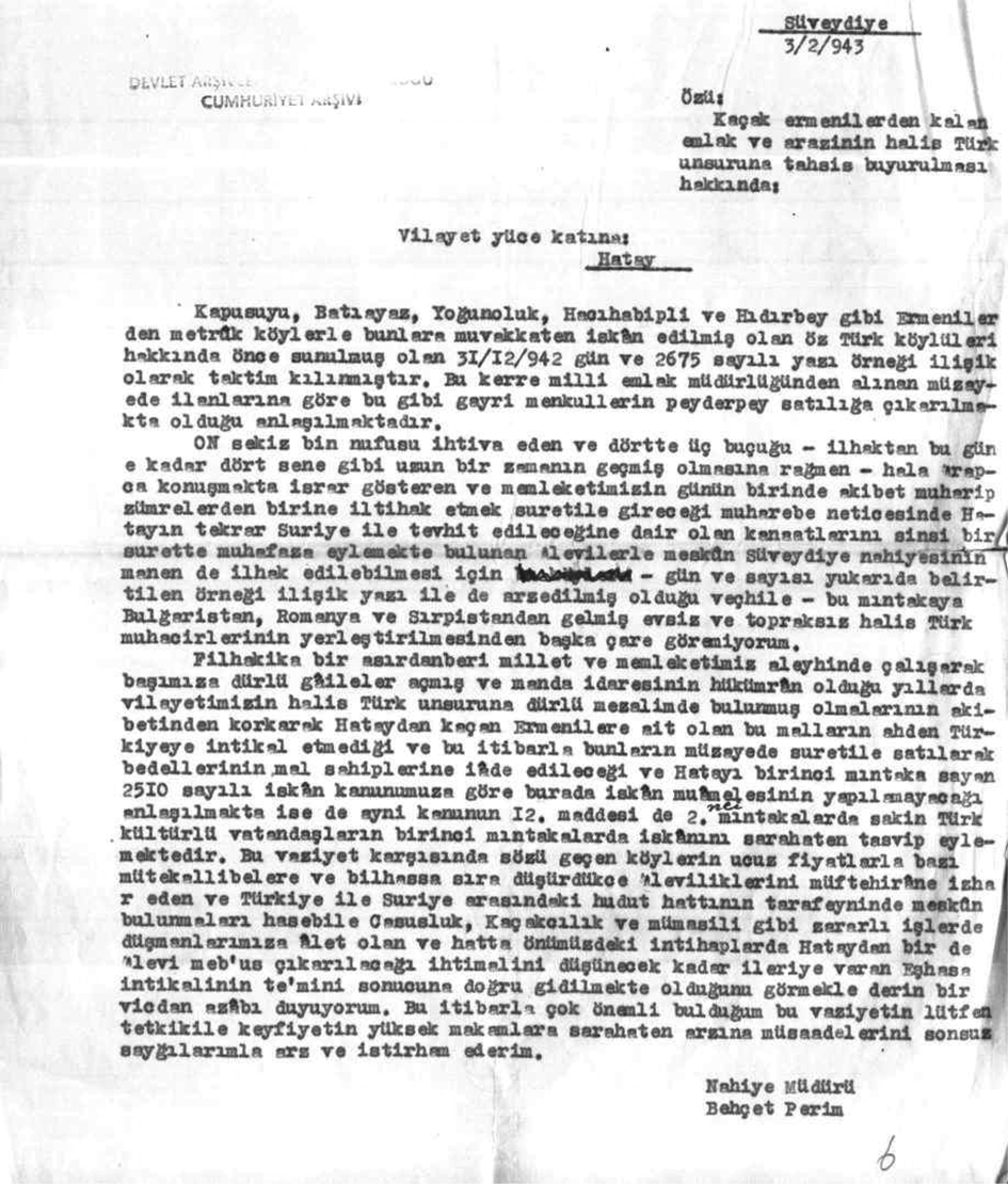 “18 bine yaklaşan nüfuslarıyla, Hatay’ın ilhakından dört yıl geçmesine rağmen, asimile olmadıkları gibi, günün birinde Türkiye’nin Suriye ile girebileceği bir savaşta, bunların Suriye’nin yanında yer alacaklarından kuşkulanmaktadır. Alevilerle meskûn (yerleşik) Süveydiye (Samandağ) nahiyesinin manen de ilhak edebilmesi için, bu mıntıkaya Bulgaristan, Romanya ve Sırbistan’dan gelmiş evsiz ve topraksız halis Türk muhacirlerinin yerleştirilmesinden başka çare göremiyorum”.