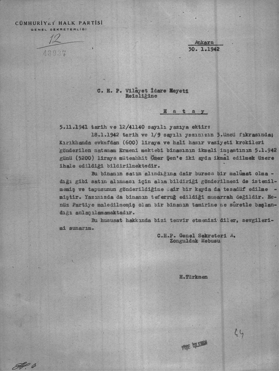 30. 1. 1942 tarihli ikinci rapor, Cumhuriyet Halk Partisi Genel Sekreterliği tarafından, Hatay, C.H.P. Vilayet İdare Heyeti Reisliğine gönderilmiştir.