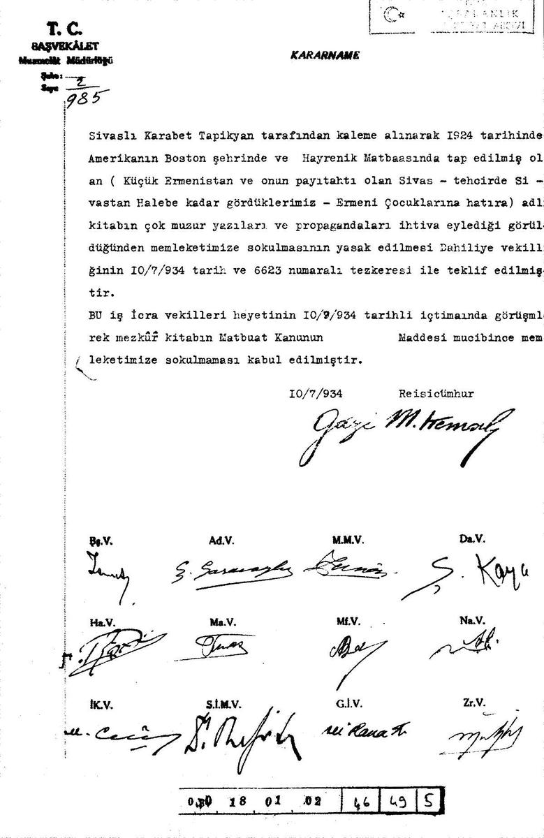 “… Sivaslı Karabet Tapikyan tarafından kaleme alınarak 1924 tarihinde Amerikanın Boston şehrinde ve Hayrenik Matbaasında tap edilmiş olan (Küçük Ermenistan ve onun payitahtı olan Sivas – tehcirde Sivastan Halebe kadar gördüklerimiz – Ermeni çocuklarına hatıra) adlı kitabın çok muzur yazıları ve propagandaları ihtiva eylediği görüldüğünden memleketimize sokulmasının yasak edilmesi Dahiliye ve killiğinin 10 / 7 / 934 tarih ve 6623 numaralı tezkeresi ile teklif edilmiştir.