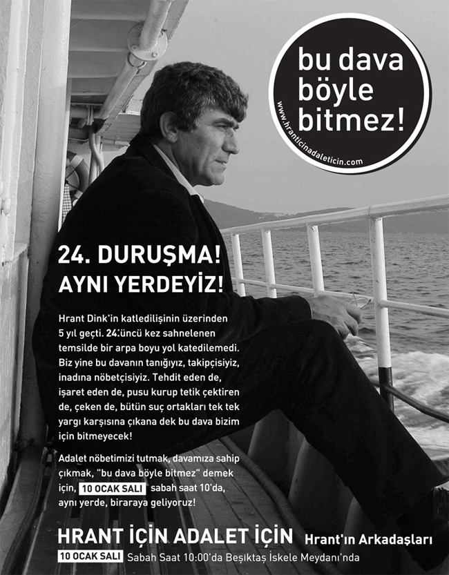 Hrant Dink'in katledilişinin üzerinden 5 yıl geçti. 24. kez sahnelenen temsilde bir arpa boyu yol katedilemedi. Biz yine bu davanın tanığıyız, takipçisiyiz, inadına nöbetçisiyiz. Tehdit eden de, işaret eden de, pusu kurup tetik çektiren de, çe ken de, bütün suç ortakları tek tek yargı karşısına çıkana dek bu dava bizim için bitmeyecek! Hrant'ın Arkadaşları