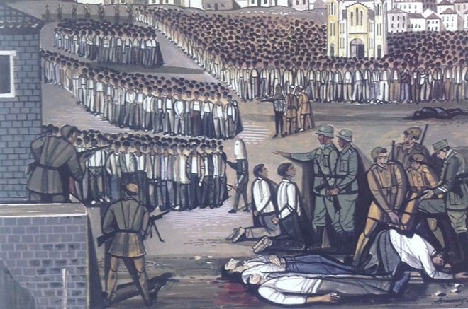 İnfaz yerine götürülene kadar kurbanlar ihanet etmeleri için insanlık dışı işkencelere maruz kalmaktadır. İnfaz edilenlerin cesaretinin ve yüksek ruhunun bir özelliği, hiç kimsenin başka bir yoldaşa ihanet etmemiş olmasıdır. Daha önce ölenlerin çoğu, diğerlerine cesaret vererek faşizme karşı savaşmaya çağırmaktadır. İnfaz yeri, Kilikia ve Thira caddelerinin birleştiği yerde, bir halı üreticisinin arsasının bulunduğu Osias Ksenias meydanının yakınındadır.