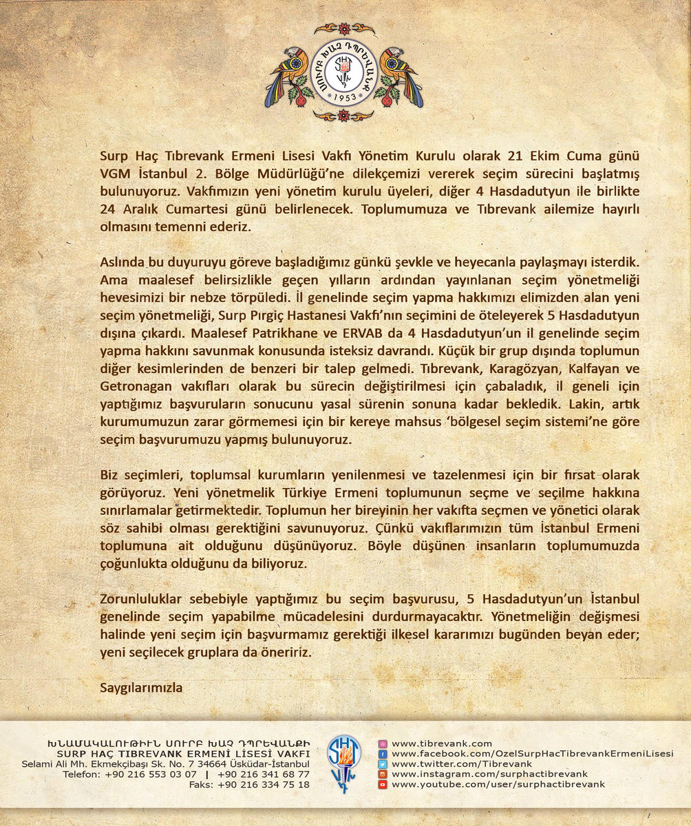 Surp Haç Tıbrevank Ermeni Lisesi Vakfı, 24 Aralık Cumartesi günü yönetim kurulu seçimi yapmak için Vakıflar Genel Müdürlüğü'ne başvurdu.