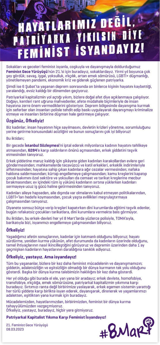 Açıklamada deprem sonrası yaşananlara da dikkat çekildi ve "Hayatı sürdürme, yeniden kurma yükünün afet durumunda da kadının üzerinde olduğunu, temel ihtiyaçlarının nasıl ikincilleştiğini görüyoruz ve depremin üzerinden daha 1 ay geçmişken kadınların hayatlarının daraltıldığına tanıklık ediyoruz" dendi.