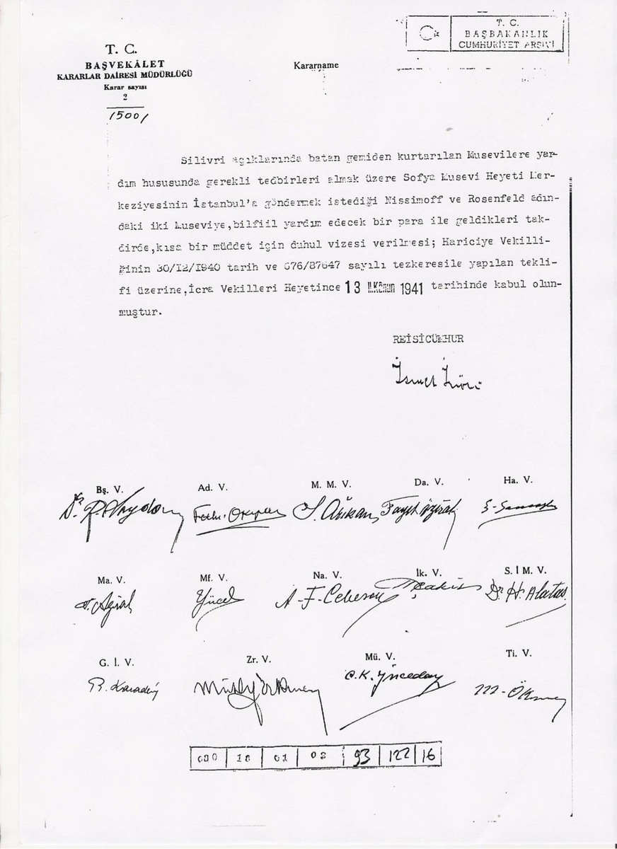 “Silivri açıklarında batan gemiden kurtarılan Musevilere yardım hususunda gerekli tedbirleri almak üzere Sofya Musevi Heyeti merkeziyesinin İstanbul’a göndermek istediği Nissimoff ve Rosenfeld adındaki iki Musevi’ye, bilfiil yardım edecek bir para ile geldikleri takdirde, kısa bir müddet için duhul (giriş) vizesi verilmesi, Hariciye Vekilliğinin 30/12/1940 tarih ve 676/87547 sayılı tezkeresile yapılan teklifi üzerine, İcra Vekilleri heyetince 13 Kasım 1941 tarihinde kabul olunmuştur.” (Bkz: belge)