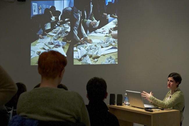 D.Ö.: Ya da üretim sürecini sorguluyoruz. O sorgulama ve bir bakıma deneysel süreç, daha sonra birlikte çalıştığımız kişiler için de ürettikleri işi bir sonraki aşamaya taşımaları için yardımcı oluyor. Kendi program sürecimizde çoğu zaman konuşma yapabiliyoruz. Daha görünür yüzümüz konuşmalar, yoğun etkinlik programları arasında gösterimler yapabiliyoruz. Aylık sergi programımız olsun gibi bir endişemiz yok. Daha çok bir iş oluştuktan sonra sergilemeyi ya da o süreci sergilemeyi amaçlıyoruz.