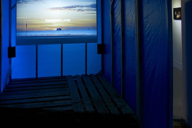 D.Ö.: Danimarkalı Nikolaj Bendix Skyum Larsen’in mülteciler üzerine bir video enstalasyonu var “Vaat Edilen Ülke”, şu an onu sergiliyoruz. New Yorklu sergi tasarımcısı Jeremy Johnston’la ortaklaşa gerçekleştirdiğimiz bir seri atölye çalışması ve sergilerin parçası olarak.