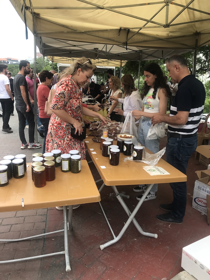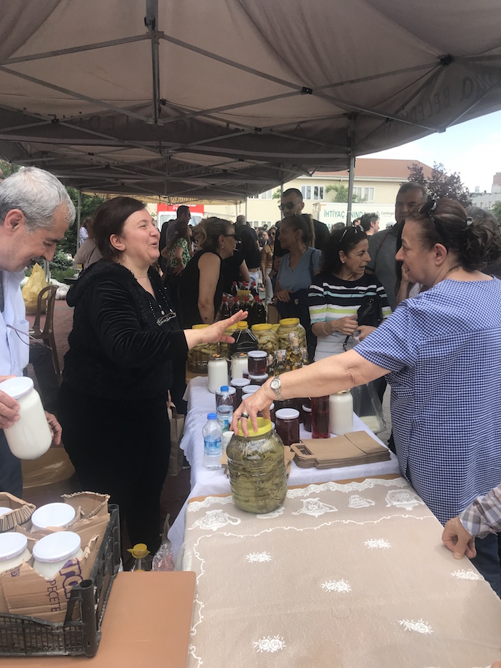 Bugün, kendi ürünlerimizle buradayız. Nar ekşisi, zeytinyağı, salça, sabun, yağda zahter, tuzlu yoğurt, kırma zeytin ve tabi ki Altınözü’nün meşhur halhalı zeytiniyle. Buraya, sadece kermes için geldim. Açıkçası, burada diğer Antakyalılarla beraber olmak çok güzel bir duygu. Bu kermes sayesinde birbirimizi gördük ve çok duygulandık.”