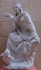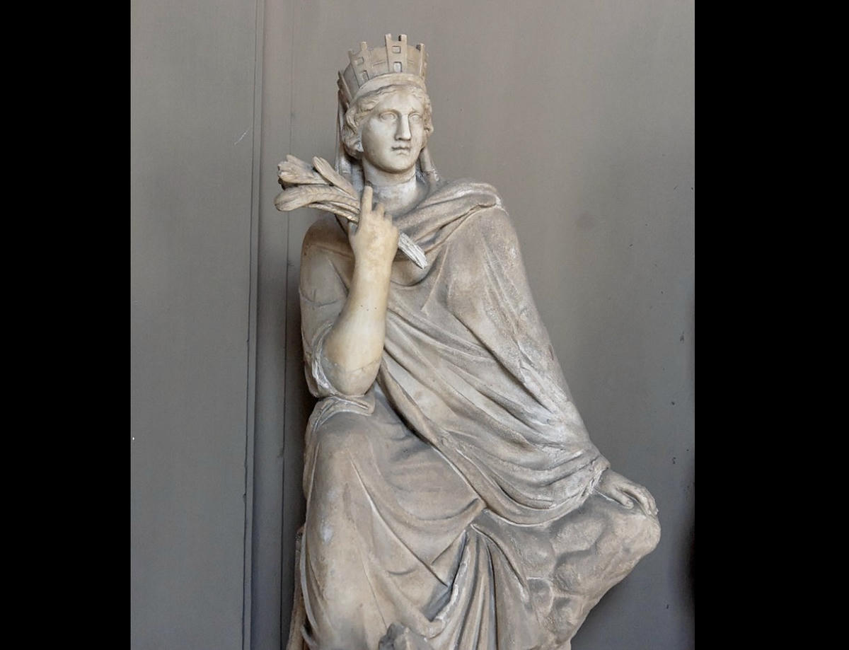 Elinde kentin zenginliğini ve bereketini simgeleyen bir başak demeti tutar. Başında kentin surlarını simgeleyen tacı, ayaklarının altında ise Asi Nehri’ni temsil eden bir erkek figürü vardır.