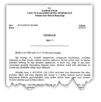 Tapu ve Kadastro Genel Müdürlüğü tarafından çıkartılan 1983 ve 2001 tarihli iki genelge, 1915 sonrasında devlet tarafından el konulan gayrimüslimlere ait mülkler hakkında, ilgili kişilere ve varislerine bilgi verilmesini yasaklıyor. Buna göre, 1924’ten önceki tapu kayıtlarıyla ilgili olarak, tehcir veya mübadele edilen gayrimüslimlerin mirasçılarına, Tapu Müdürlükleri hiçbir surette bilgi vermeyecek.