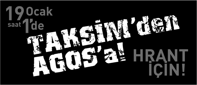 'Hrant'ın Arkadaşları' desteğinizi bekliyor; 'HRANT İÇİN! 19 Ocak'ta, Saat 1'de Taksim'den Agos'a, vurulduğu yere yürüyoruz! Taksim Meydanının Elmadağ’a bakan yönünde toplanacağız ve AGOS’un önüne yürüyeceğiz. Slogan yok. Örgütsel flama, bayrak yok. Bu sessiz bir çığlık.'