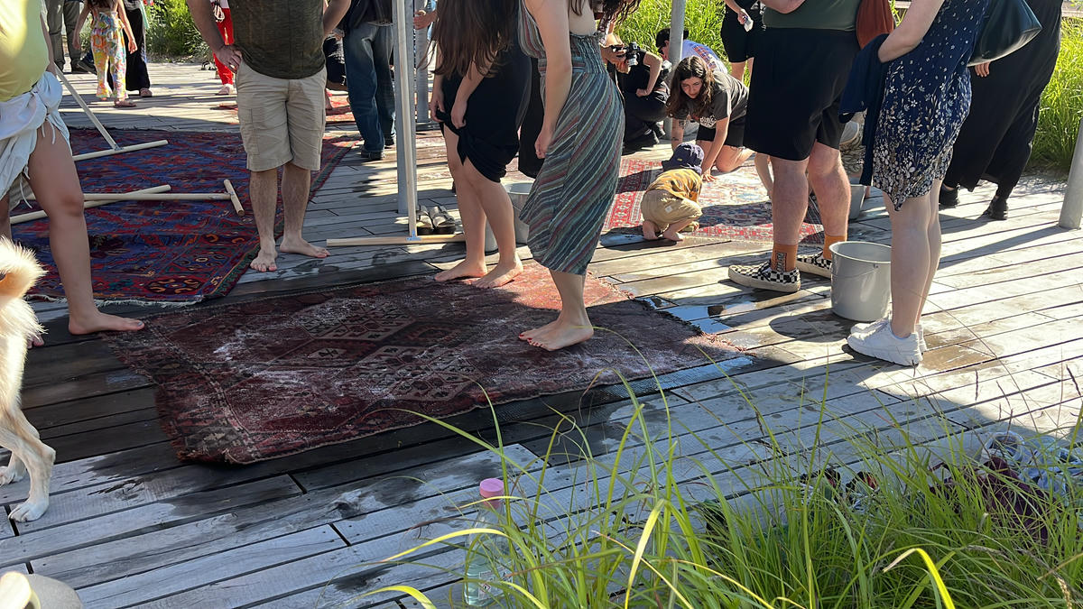 Eskiden hem halı dokuma hem de halı yıkama kolektif eylemlerdi. Sözünü ettiğim etkinlikte, Berlin’e çeşitli ülkelerden getirdiğimiz halıları yıkamak, bizi bir an için de olsa, bize aktarılan travmaların ve hikâyelerin ağırlığından kurtardı. Yıkama eylemi, hikâyeleri geçmişin ağırlığından azat edip bugüne taşıdı; müzik ve halay eşliğinde âdeta kolektif bir arınma ritüeli oldu. Genç yaşlı hepimizi bir araya getirerek, bu kez tebessümle yapılan bir topluluk inşası eylemine dönüştü.