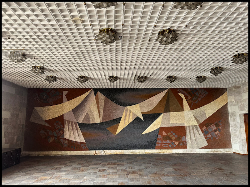 Floresan lambasından gelen cızırtı, ışığın rengi ve solukluğu, kitapların kokusu, yazı fontları bir anlığına sizi Sovyetlere götürürken, kitap koridorlarını bitirip lobiye çıktığınızda sizi tekrar bugüne çağıran çok ilginç bir mekan. Burada öne çıkan diğer bir detay ise, kütüphane lobisinde bulunan, geçen sene şahsen tanışma fırsatı bulduğum değerli sanatçılar Zohrab Mirzoyan ve Edward Karsyan tarafından yapılmış Sovyet mozaik sanatının en nadide örneklerinden olan Uçan Haberler (Krunk/Grung/Turna) eserine ve yine geç Sovyet dönemine ait -çok iyi bir biçimde muhafaza edil-miş- konferans salonuna ev sahipliği yapması.