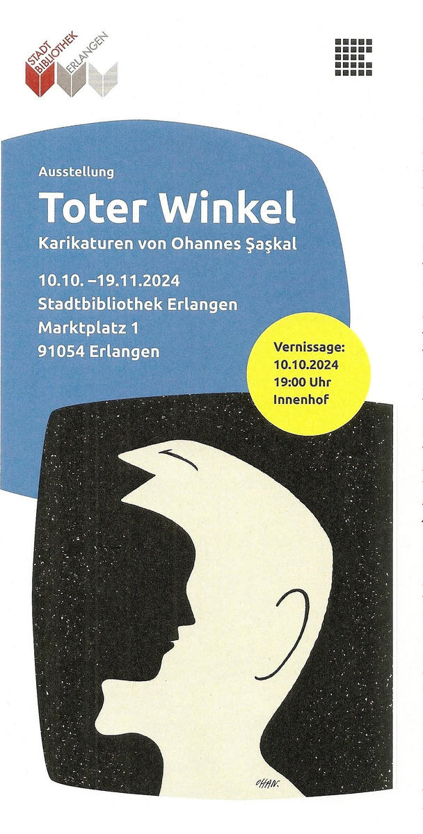 Ohan'ın elliye yakın karikatüründen oluşan "Kör Nokta" (Toter Winkel / Blind Spot ) adlı sergisi , Almanya'nın Erlangen şehrinde, Şehir Kütüphanesi (Stadtbibliothek) binasında 10 Ekim tarihinde açılacak.