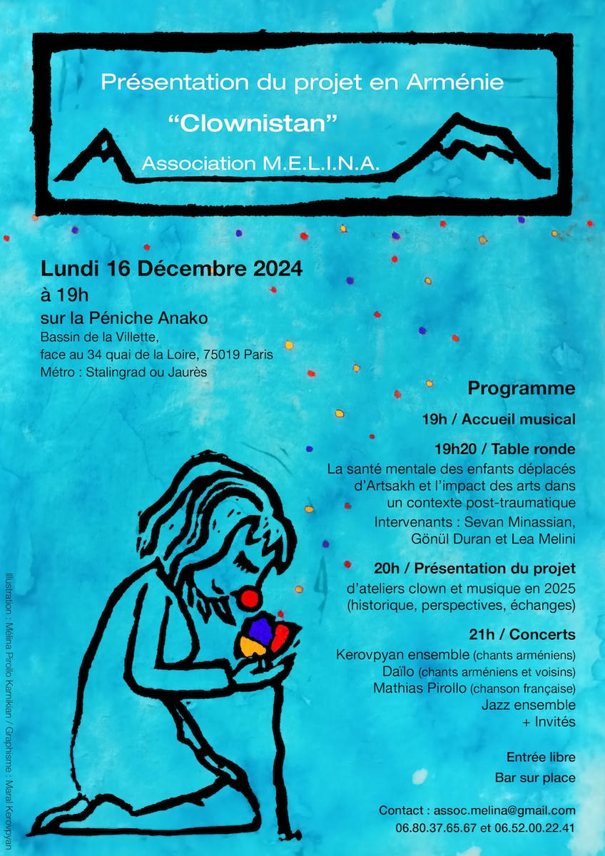 Fransız Meliné Derneği, 2025 Şubat ayında Ermenistan’da, özellikle Dağlık Karabağ’dan yerinden edilmiş çocuklar için kapsamlı bir palyaço ve müzik atölyesi projesi başlatıyor. Projenin amacı, savaş ve zorla yerinden edilme travmalarını yaşayan çocuklara ve gençlere, kendilerini ifade etmelerini sağlamak ve yaşadıkları durumun şiddetine rağmen hareket etme yeteneğini geri kazandırmak.