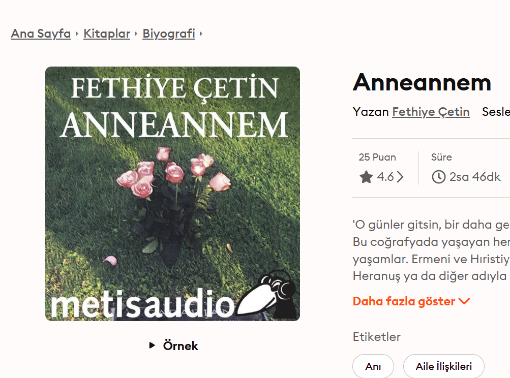 Avukat ve yazar Fethiye Çetin'in "Anneannem" ve "Utanç Duyuyorum! Hrant Dink Cinayetinin Yargısı" kitapları Storytel'de sesli kitap olarak yayınlandı. Çetin, "Her iki kitabın da özellikle gençlere ulaşmasını diliyorum" diyor.