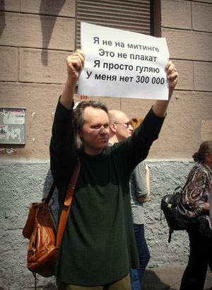 Yeni izinsiz miting yasasına protesto. Pankartta; 'Ben mitingde değilim. Bu pankart değil. Sadece geziyorum, 300 bin rublem yok' yazıyor. |