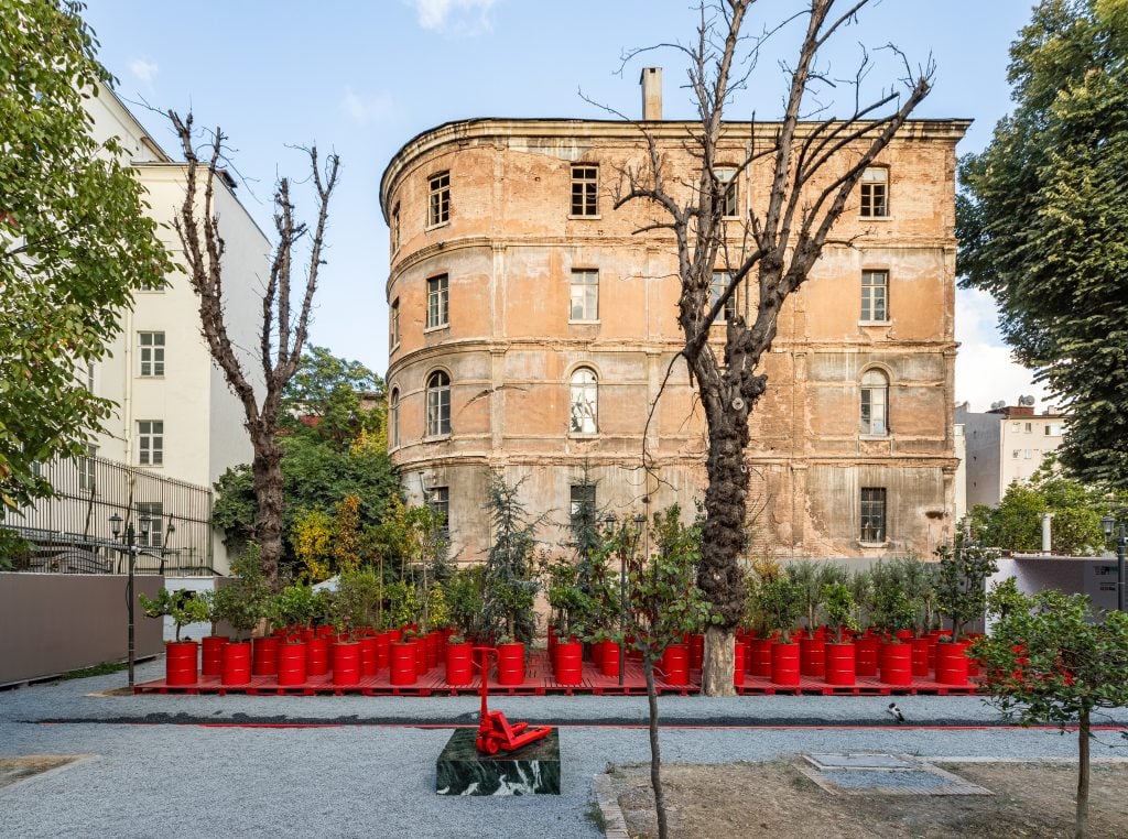 Bu yıl bienal, Beyoğlu–Karaköy hattında yürüme mesafesindeki sekiz mekâna yayılıyor. Eski Fransız Yetimhanesi Bahçesi’nde sanatçı Khalil Rabah’ın yerleştirmesi karşılıyor bizi. Su ile zemini buluşturan kırmızı uzun borular, kalabalıkta yürümeye çalışanları yönlendiriyor; kimi izleyicilerden “çantalarımızı buraya koymayalım” fısıltıları duyuluyor. Böyle anlarda bienalde yer alan eserlerin mekânla kurduğu ilişki, izleyici ve eser arasındaki yaklaşımı da etkileyebiliyor. Neyse ki kahkahalar eşliğinde şu cevap geliyor: Koyun çantanızı, ne de olsa sanat yaşayan bir şey!