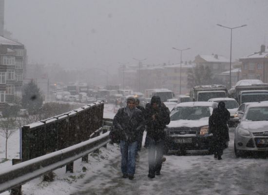 İstanbul’da sabah saatlerinden itibaren etkili olan kar yağışı trafiği olumsuz yönde etkiledi. Uzun araç kuyrukları oluşan yollarda sürücüler araçlarında mahsur kaldı. İstanbul Valiliği, kar yağışı nedeniyle yarın ilk ve orta dereceli okullarda eğitime bir gün ara verildiğini bildirdi.
